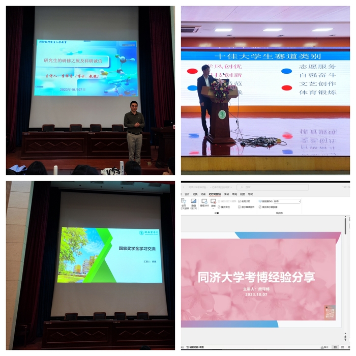 10月7日下午,学院邀请校“十佳教师”、硕士生导师李祥子教授为同学们作主题为“研究生的研修之旅及科研诚信”的学术报告;邀请“十佳老员工”闫浩浩、“优秀学子”柴杰、国家奖学金获得者姚惠,以及分别考取吉林大学、同济大学、安徽医科大学博士的2023届毕业生罗倩、闵珂婷、李秋伟等分享在学习、生活、科研、考博等方面的经验,引导广大新生向榜样学习,努力提高专业能力,争当先进典型。