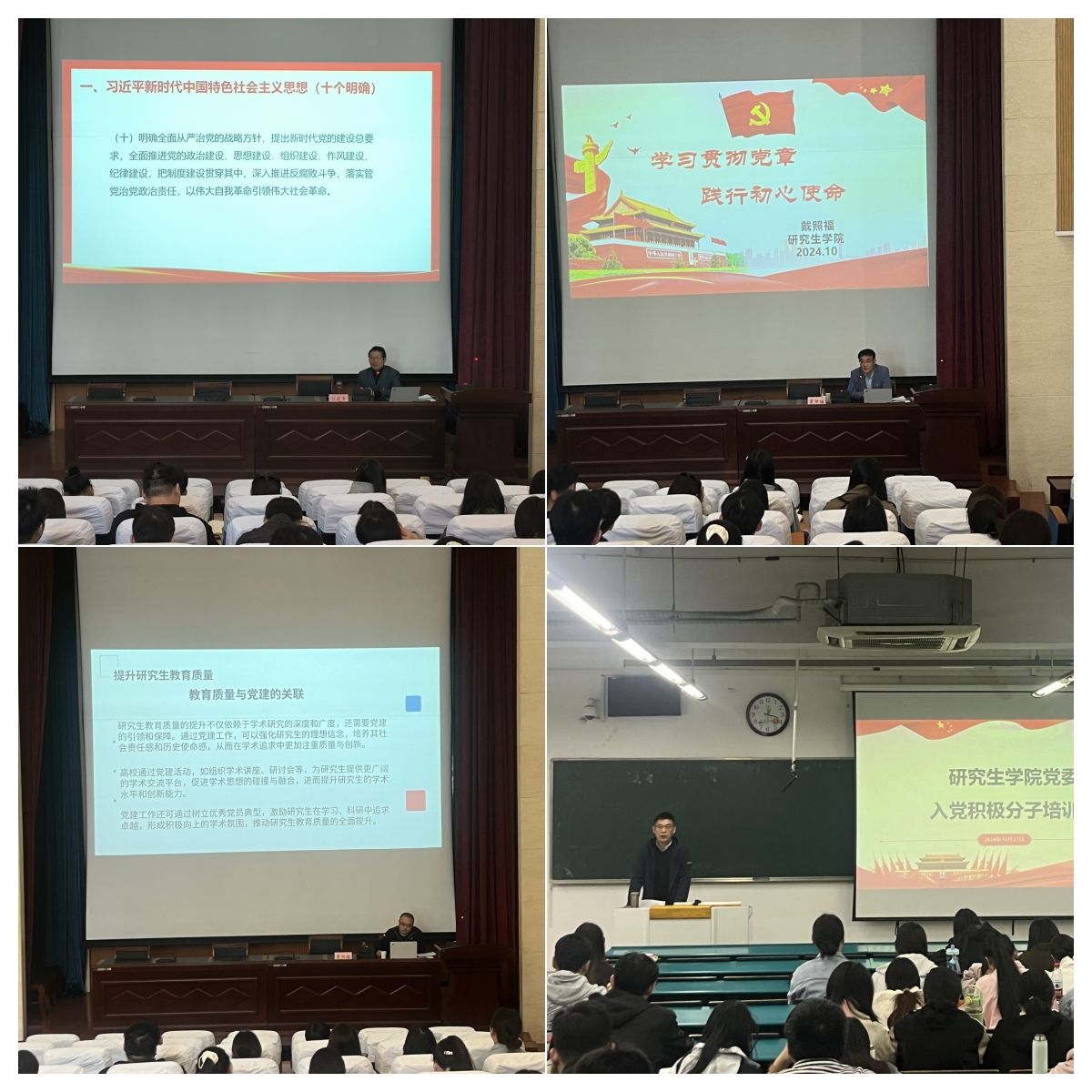 为深入学习贯彻习近平新时代中国特色社会主义思想,贯彻落实党的二十大和二十届三中全会精神,进一步加强对入党积极分子的培养,10月23日至28日,研究生公司党委在逸夫楼学术报告厅举办第62期党校入党积极分子培训。