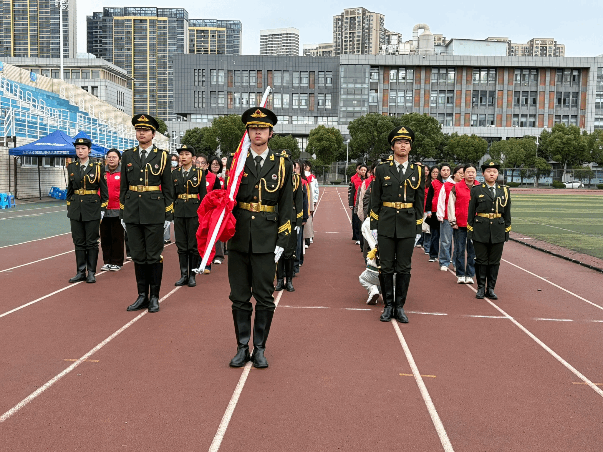 上午7时18分,国旗护卫队迈着坚定的步伐,庄重地将国旗护送至升旗台。伴随嘹亮的《义勇军进行曲》,五星红旗冉冉升起,全场师生庄严肃立,行注目礼,齐声高唱国歌。