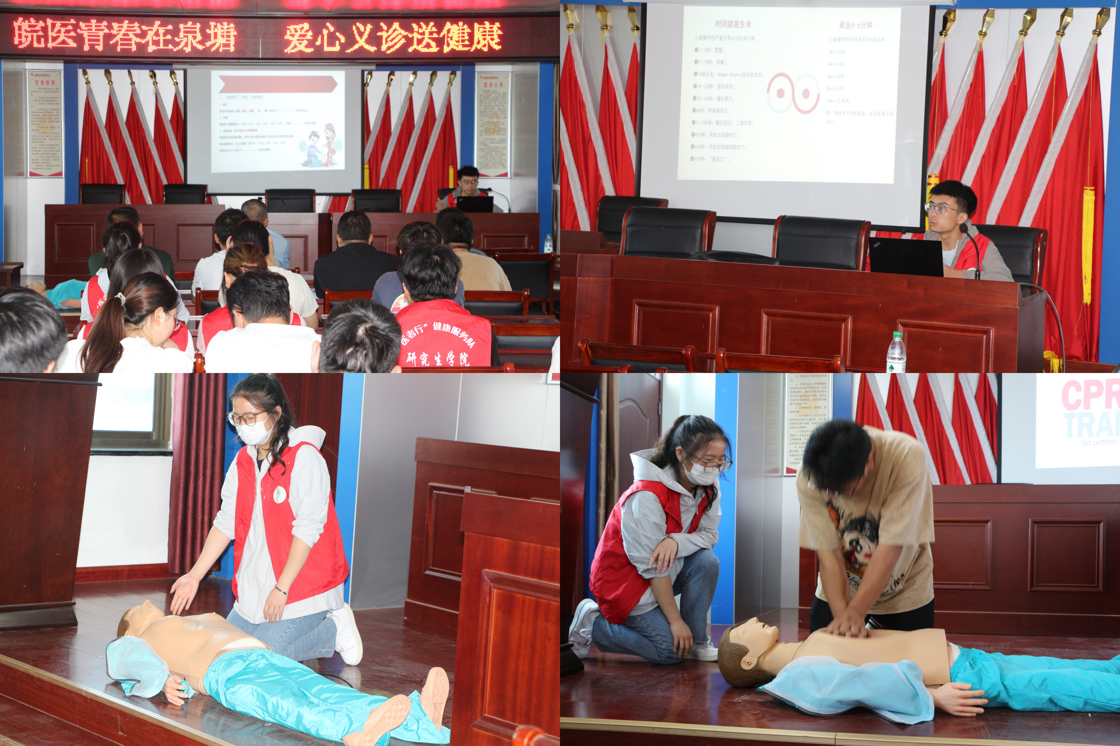 举办科普培训,普及急救知识。本次社会实践活动除了健康义诊活动之外,志愿者还面向当地社区服务工作者开展了急救知识心肺复苏技能培训,手把手、一对一指导其掌握操作规程、开展实操练习,帮助当地社区工作者增强急救意识和学会急救技能,以应对不时之需。