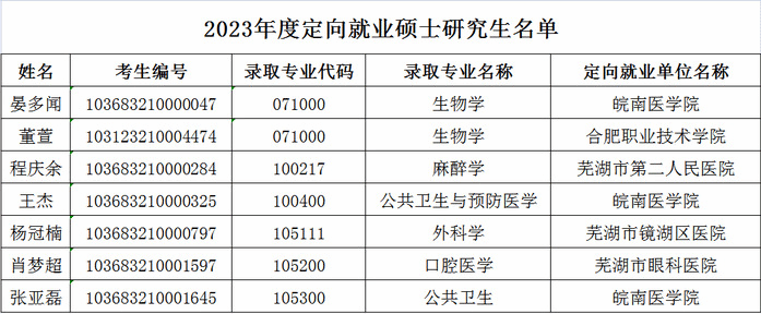 2023年硕士研究生招生结束后,公司共收到《皖南医学院定向就业硕士研究生协议书》7份,现将2023年度定向就业硕士研究生名单公布如下。若有疑问请拨打咨询电话:0553-3932281。