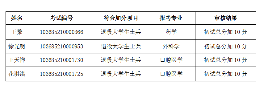 根据教育部有关文件精神,考生网上报名时的加分申请以及相关证明材料,经审核,以下考生符合硕士研究生招生考试加分政策,具体名单如下: