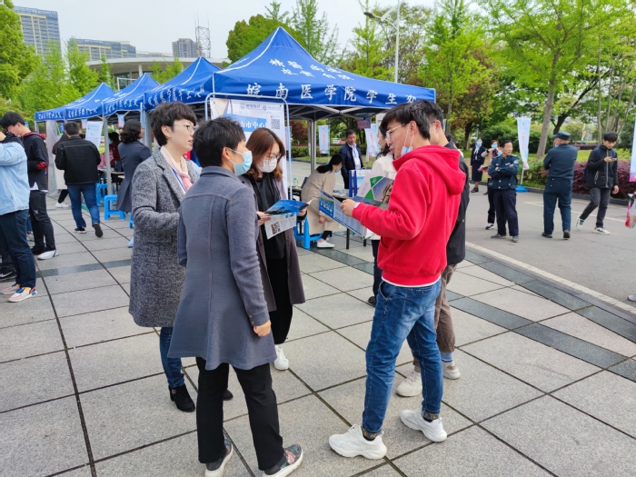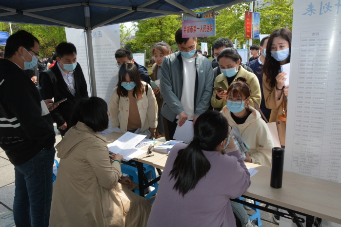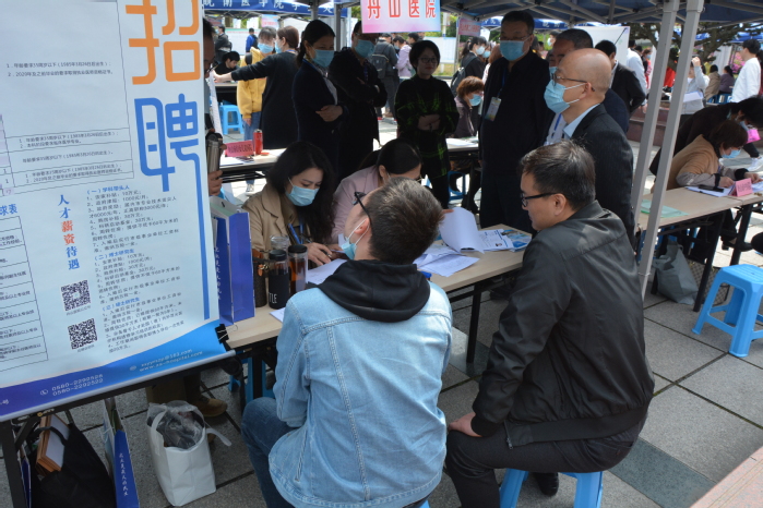 当天下午舟山市卫健委、杭州市临安区卫健局、海宁市卫健局、马鞍山市中心医院、淮南联合大学等25家单位进行了现场招聘面试。