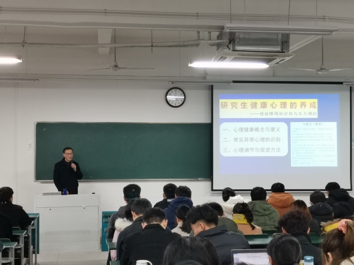 刘教授从心理健康的概念与意义、常见异常心理的识别、心理调节与促进方法三个方面为同学们做了深入浅出的讲解。通过日常案例分析,刘新民教授将丰富的心理学理论知识和实践相结合,向研究生们普及了情绪障碍的识别与压力调控的方法。报告中妙语连珠,赢得了同学们的阵阵掌声。报告结束后,同学们就学习、情感、工作等方面存在的问题进行了提问和交流。
