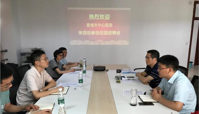 刘晓平首先对刘支援一行的到来表示热烈欢迎,对宣城市中心医院关心支持公司研究生就业工作表示感谢。他表示学院会全力支持配合招聘工作,实现医院和员工的双赢。张敉伟就本次招聘工作的政策、计划和流程做了详细介绍,并对相关工作环节和流程设计与公司进行了交流和讨论。