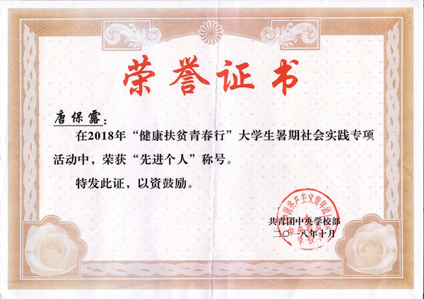 10月24日-26日,由共青团中央学校部主办的2018年“健康扶贫青春行”老员工暑期社会实践专项活动总结展示会在滨州医学院圆满举行。公司研究生唐保露同学作为全国25名“健康扶贫青春行”老员工暑期社会实践专项活动“先进个人”之一应邀参会。