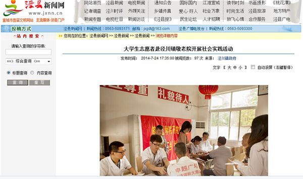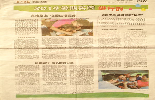 2014年暑期,太阳成官网团委积极响应校团委暑期“三下乡”的号召,活动紧紧围绕“为祖国勤学修德 以实践明辨笃实”的主题,选拔5名队员参加国家级暑期社会实践团队,组建了三支省级团队,一支校级团队,开展了安徽省四所医学院校研究生教育实践育人首次联合行动,活动受到临泉县电视台、大江晚报、泾县新闻网、泾川先锋网等媒体的报道。