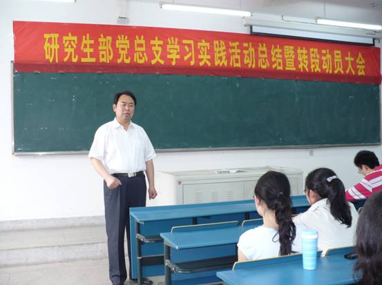 5月19日下午,研究生部党总支于东504教室召开了学习实践活动第一阶段总结暨转段动员大会,对总支第一阶段学习实践活动进行总结并对下一阶段的工作进行动员部署。总支学习实践活动联系人李朝品副经理,全体党员和预备党员参加了会议。会议由总支书记胡剑北主持。