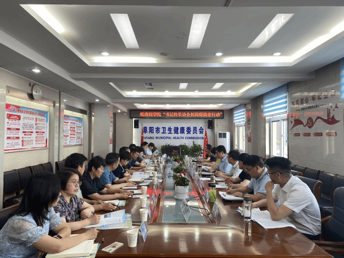 阜阳市卫健委和各家医院领导分别介绍了阜阳市医疗卫生事业及医院的基本情况、人才需求和招聘现状等。最后,双方就常态化合作机制、人才供需、专场招聘会等事宜进行了深入地交流,旨在为公司毕业生开拓更多优质的就业岗位,助力毕业生实现高质量就业。