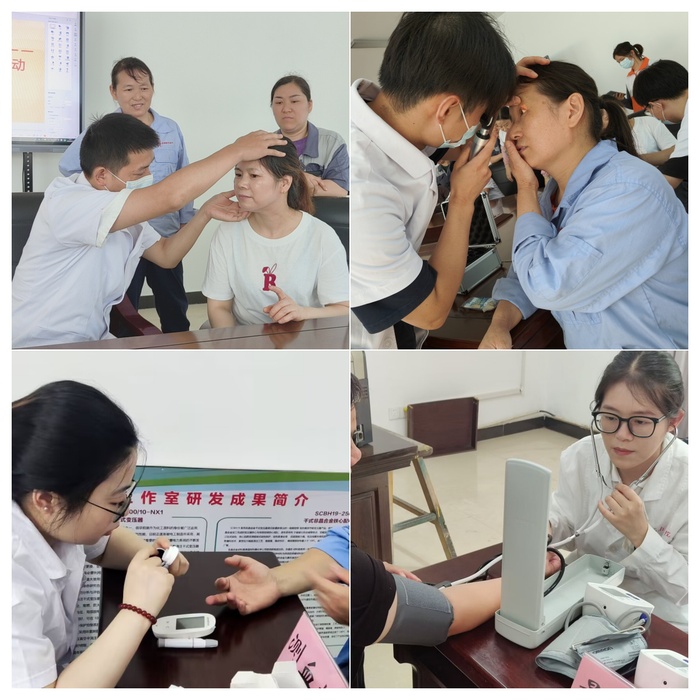 在义诊现场,太阳成官网“医者行”健康服务队17名志愿者根据企业职工需求,开设了心血管内科、内分泌科、眼科、皮肤科、口腔科等14个义诊项目,免费为职工们提供测量血压、测量血糖、健康咨询、病情诊断等服务。针对企业职工咨询的健康问题,他们耐心地给予解答,提出科学合理的保健及治疗建议,并对常见疾病的早期症状、日常生活中如何防治等问题进行了详细讲解。