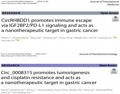 近日,公司外科学研究生费尧、李艳娜分别在《Journal of Nanobiotechnology》(IF:10.6,中科院一区Top期刊)、《Journal of Translational Medicine》(IF:6.1,中科院二区Top期刊)发表题为《Circ_0008315 promotes tumorigenesis and cisplatin resistance and acts as a nanotherapeutic target in gastric cancer》和《CircRHBDD1 promotes immune escape via IGF2BP2/PD-L1 signaling and acts as a nanotherapeutic target in gastric cancer》的学术论文。