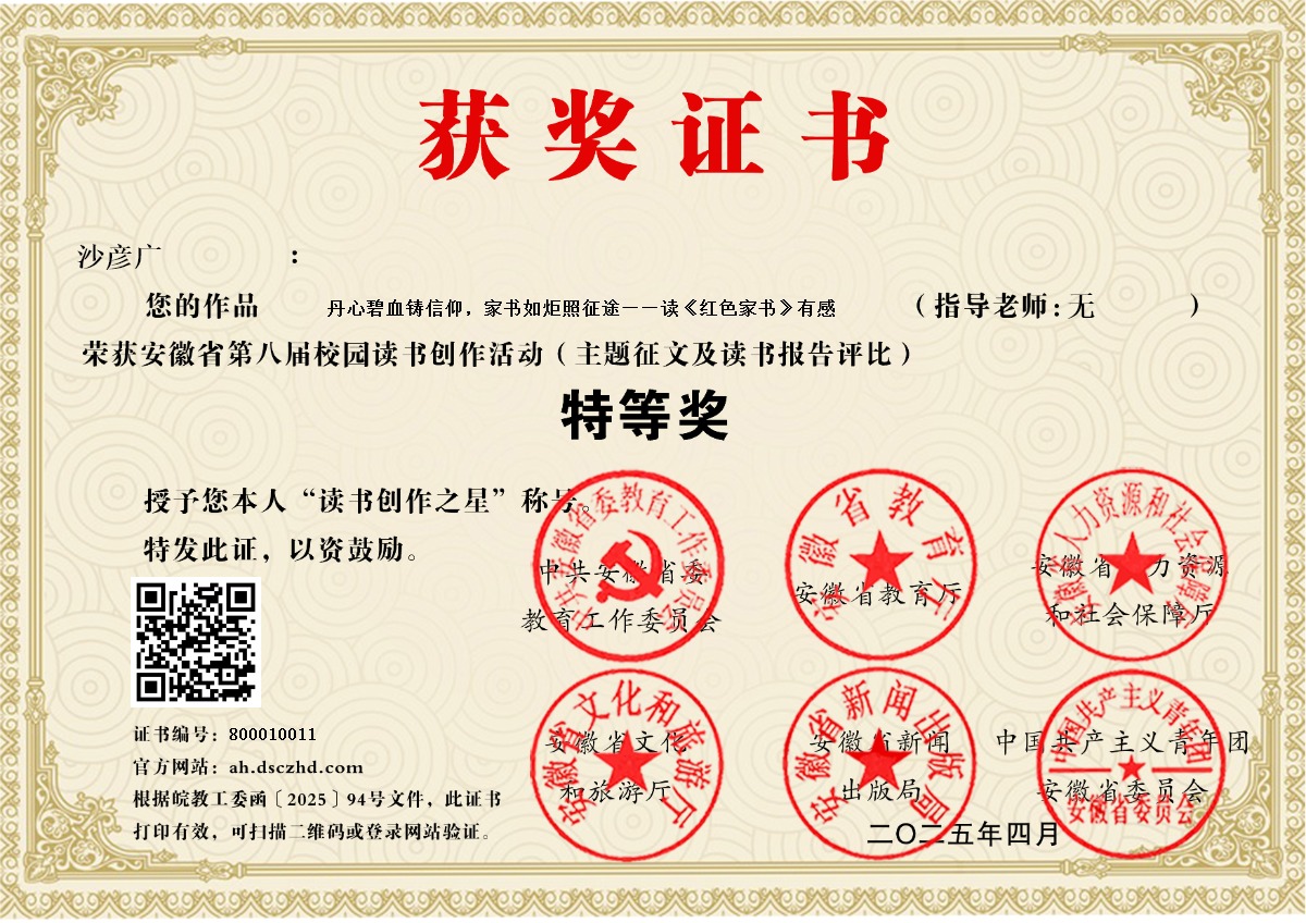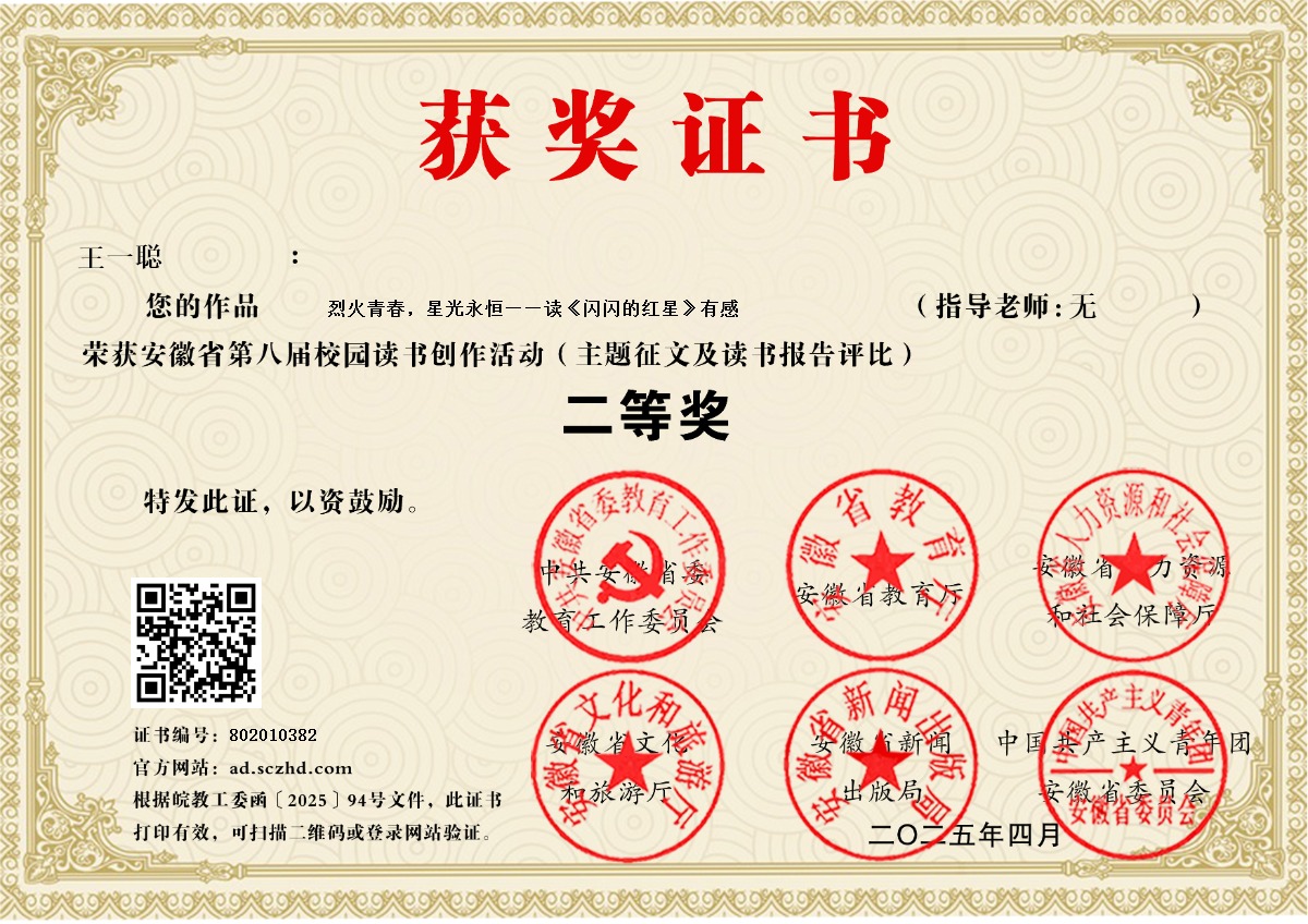 笔尖勾画青春,墨香凝聚梦想。近日,由安徽省委教育工委、省教育厅、省人力资源和社会保障厅、省文旅厅、省新闻出版局、团省委联合举办的安徽省第八届校园读书创作活动评选结果揭晓,太阳成官网2名同学凭借深厚的文学功底,在此次活动中荣获佳绩。
