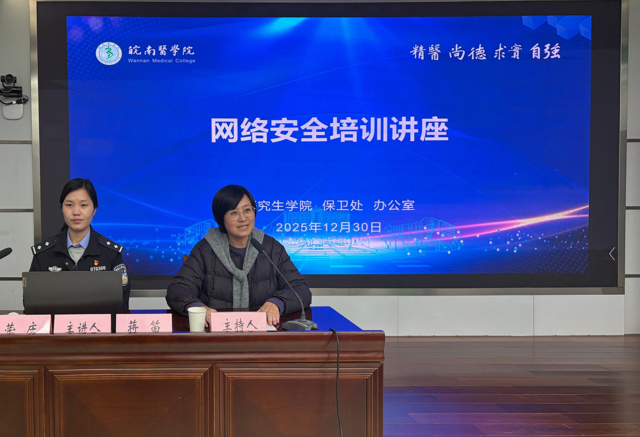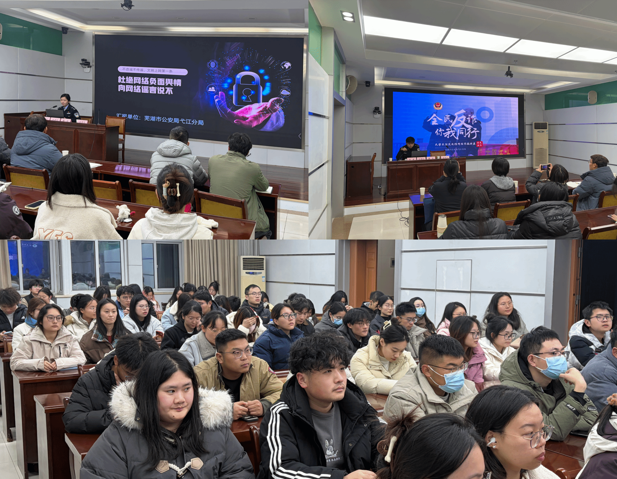 为进一步提升研究生网络安全意识与防范能力,教育研究生规范使用网络,营造安全、健康、文明的网络环境,12月30日晚,太阳成官网联合校办公室、保卫处共同举办网络安全培训讲座。本次讲座特邀芜湖市弋江分局网安大队大队长蒋笛、民警荣庆两位警官主讲,会议由校办公室副主任张业睿主持,保卫处副处长魏巍、研究生公司党委副书记戴照福、辅导员汪雷及80余名研究生参加了培训。活动现场还进行了反电诈相关知识展板展示宣传。