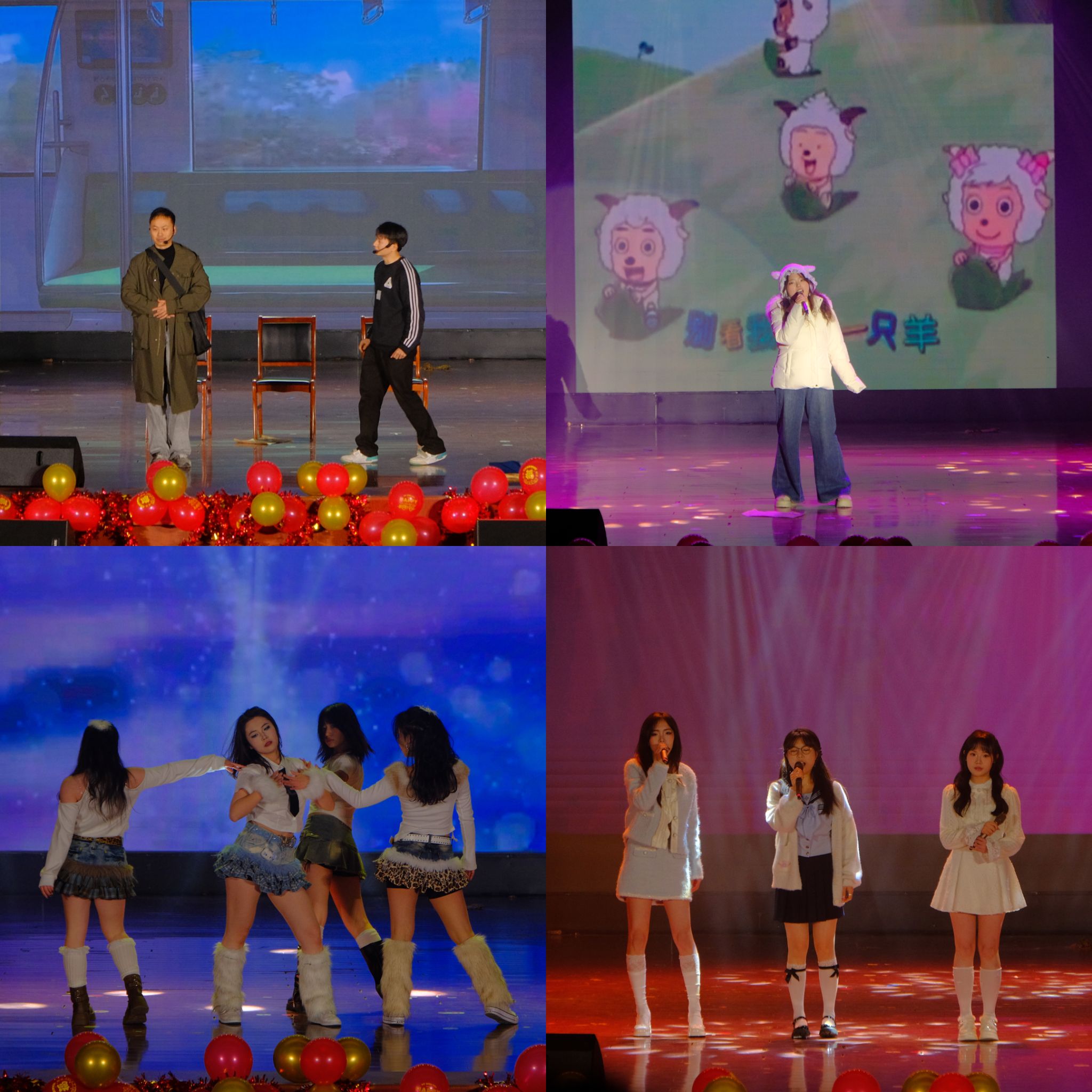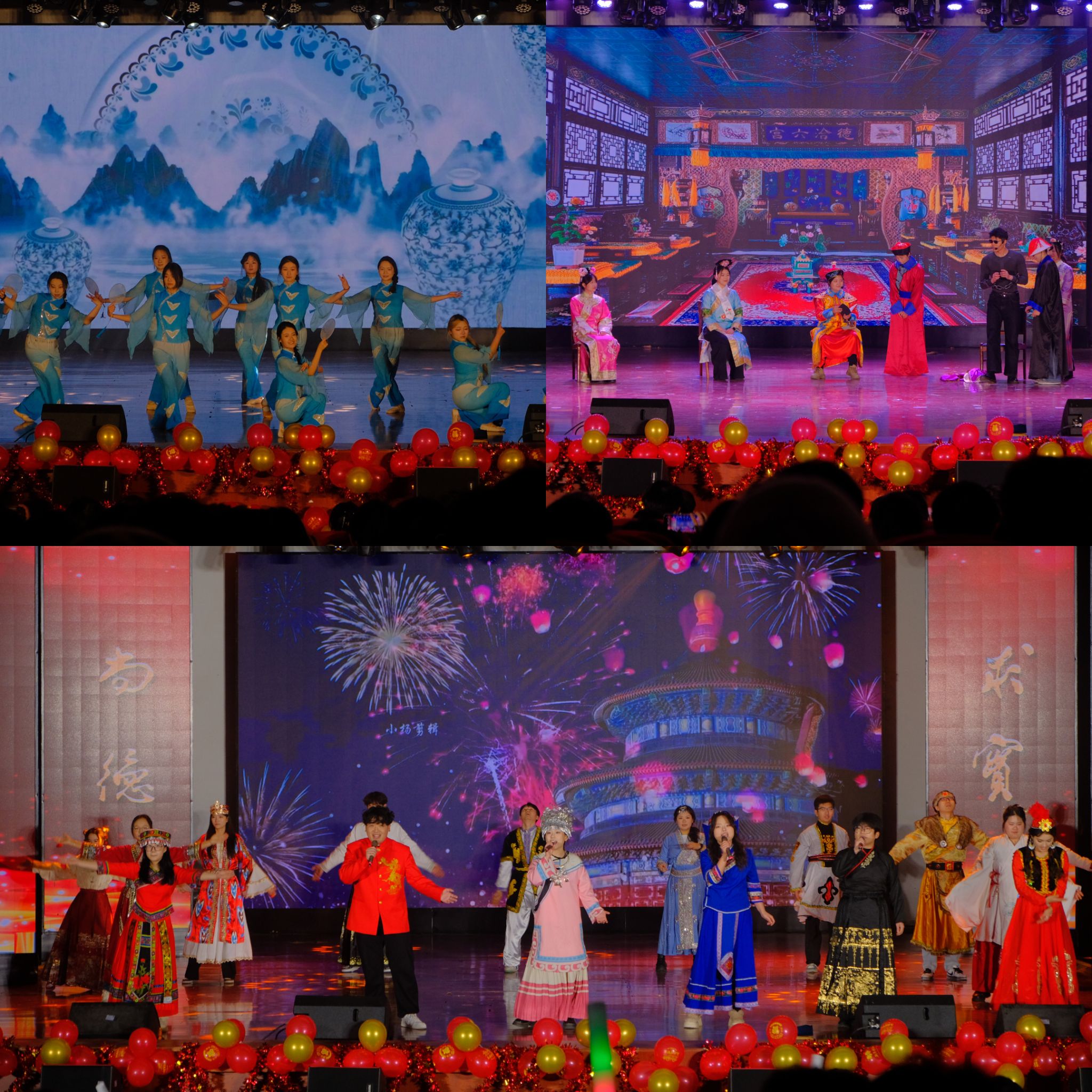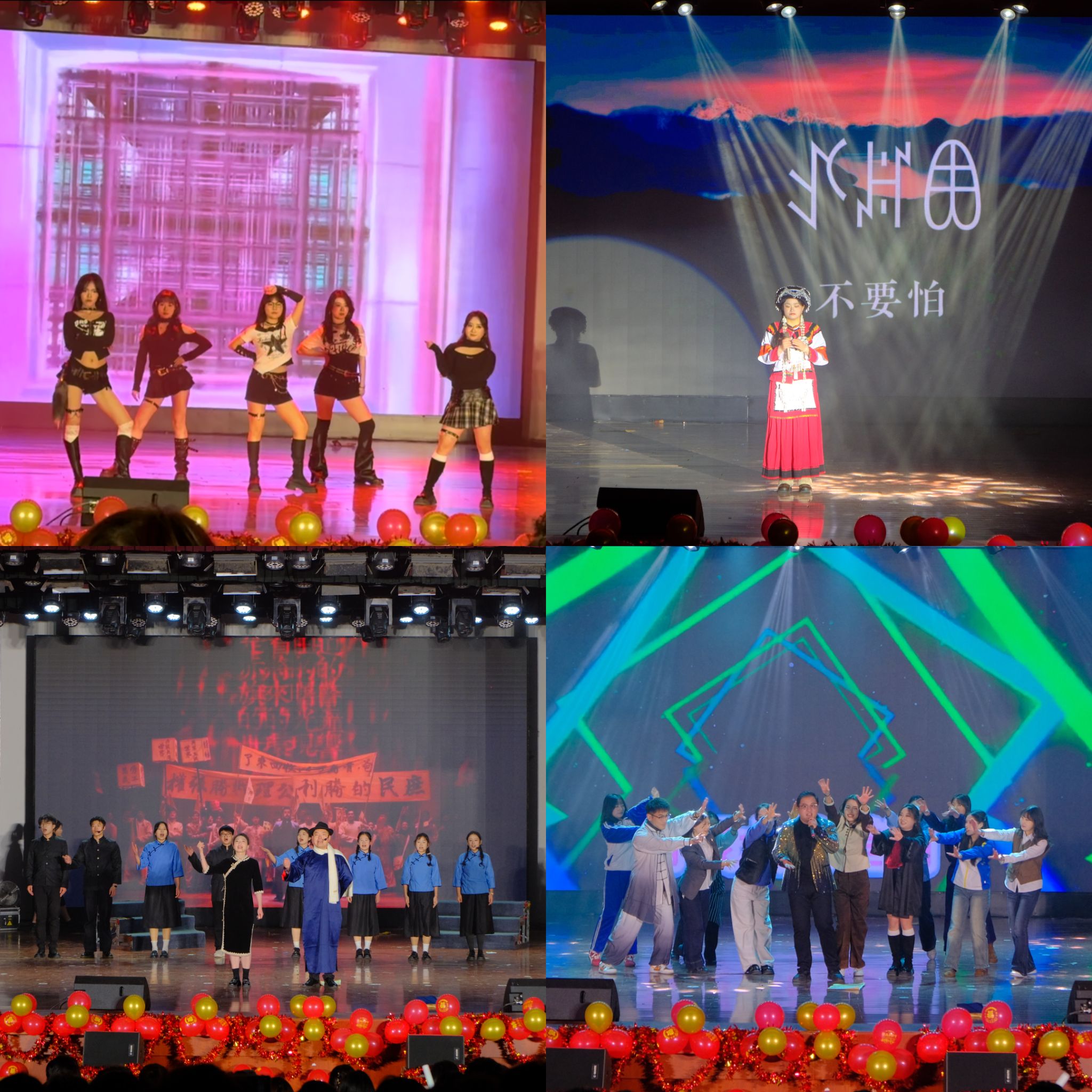 晚会现场光影交错,精彩纷呈,师生联袂呈现了一场震撼的视听盛宴。老员工艺术团舞蹈《第一天》热情开场,瞬间点燃气氛。独唱《悟空》气场全开,歌舞《改变自己》与舞蹈《魔力绽放》尽显青春蓬勃朝气。独唱《不要怕》温暖治愈,朗诵《青春中国》铿锵有力,激荡起在场师生的爱国情怀。小品《主角光环》幽默风趣,歌曲串烧《童年串烧》与《多远都要偏爱着你》深情款款。舞蹈《青花瓷》古韵悠长,《梦想成真》寄托美好憧憬。小品《翊坤宫校园诈骗集团覆灭记》独具匠心,寓教于乐。最后,合唱《魅力中国》气势恢弘,将现场气氛推向最高潮,为晚会画上了圆满句号。