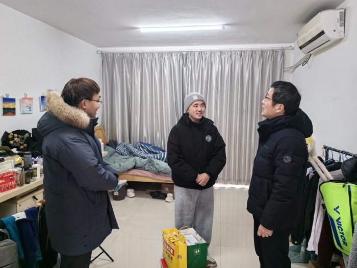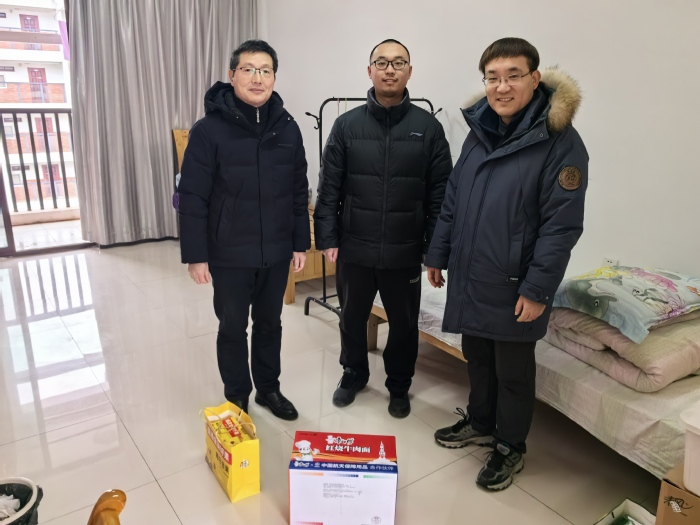 刘晓平一行深入员工宿舍,详细了解留校研究生的生活状况和学习情况。他们关切地询问了同学们在春节期间的生活安排,以及留校开展科研工作的进展。针对研究生的学习、科研、就业等方面,他们给予针对性地指导,提出了切实可行的意见和建议。同时,他们还提醒留校员工务必注意消防安全和交通安全,确保平安过节。最后,学院领导为留校的研究生送上新春大礼包,祝愿他们新春快乐、学业进步。