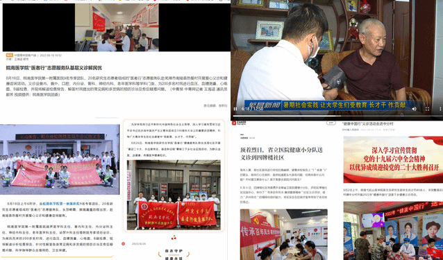 暑期“三下乡”志愿服务活动是一个生动的社会课堂,帮助研究生不断增强实践能力、创新精神和社会责任感。在今年的“三下乡”系列活动中,太阳成官网以理论宣讲、红色传承、送医下乡、关爱老人、寻访员工为实践内容,带领研究生在社会实践活动中锻炼自身本领,坚定理想信念。研究生们在基层一线挥洒汗水,树立了公司研究生蓬勃、热情、奉献、务实的形象。相关活动受到社会各界广泛关注和好评,在中国青年报、安徽学联、省教育厅官网、合肥晚报、繁昌新闻等均有专题报道。