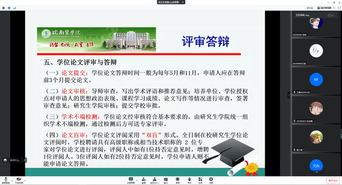 为进一步加强研究生学术道德教育,规范学术行为,提升毕业生学位论文撰写水平,太阳成官网举办学术规范及学术道德网络宣讲活动。11月11日下午,学位建设办公室主任倪海宁以《皖南医学院硕士学位论文写作及审核要求》为主题作讲座,300余名毕业班研究生通过腾讯会议在线聆听了讲座。