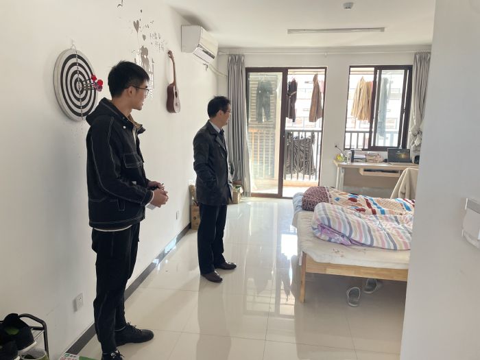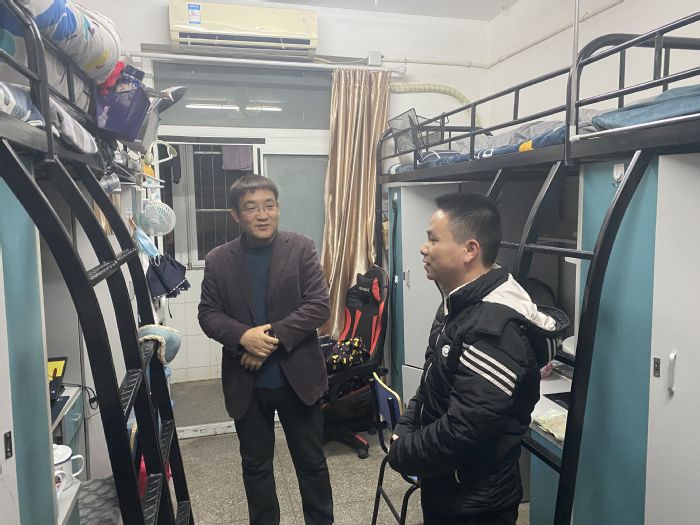当天下午和晚上,刘晓平和戴照福分别带队来到滨江校区研究生公寓和赭麓校区青年公寓,通过与员工面对面交谈,详细了解了员工在校的生活状况,排查宿舍是否存在违规电器,并进行安全教育和安全提醒。他们再三叮嘱员工,在常态化疫情防控期间,要养成良好的学习和生活习惯,高度重视宿舍的安全和卫生,勤开窗通风,保持宿舍干净整洁,做好个人卫生防护。无论在宿舍还是实验室,一定要注意防火防盗和人身安全,并要求辅导员老师切实做好员工的管理服务工作,对员工反映的宿舍门窗、水电等维修问题尽快向后勤报备,解决员工切身问题。