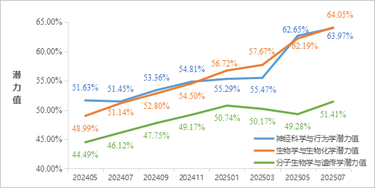 生物学与生物化学:据2025年7月数据统计,公司生物学与生物化学进入全球前百分之一潜力值为64.05%,较1月份提升7.33%,较去年同期提升12.91%。