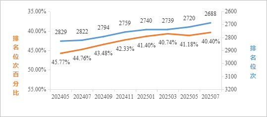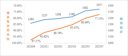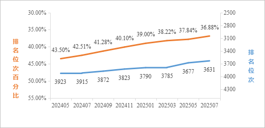 2025年7月最新数据统计,在ESI所有学科综合排名中,全球共有9845家机构进入前1%,公司位列全球3631名,排名较1月提升159名,较去年同期(2024年7月)提升284名;位次百分比为36.88%,较1月提升2.12%,较去年同期提升5.63%。