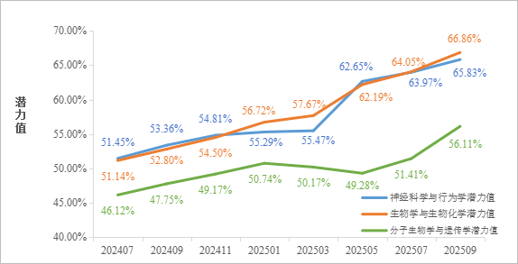 生物学与生物化学:据2025年9月数据统计,公司生物学与生物化学进入全球前百分之一潜力值为66.86%,较1月份提升10.14%,较去年同期提升14.06%。