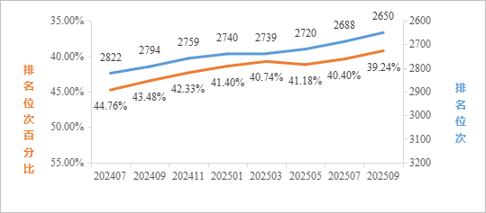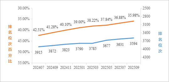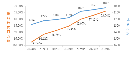 2025年9月最新数据统计,在ESI所有学科综合排名中,全球共有9990家机构进入前1%,公司位列全球3594名,排名较1月提升196名,较去年同期(2024年9月)提升278名;位次百分比为35.98%,较1月提升3.02%,较去年同期提升5.30%。