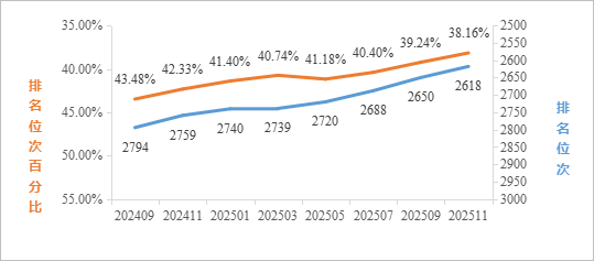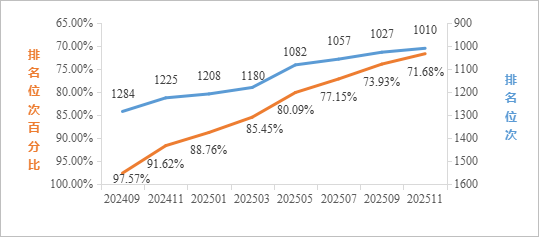 2025年11月最新数据统计,在ESI所有学科综合排名中,全球共有10158家机构进入前1%,公司位列全球3553名,排名较1月提升237名,较去年同期(2024年11月)提升270名;位次百分比为34.98%,较1月提升4.02%,较去年同期提升5.12%。