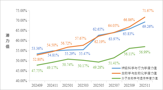 生物学与生物化学:据2025年11月数据统计,公司生物学与生物化学进入全球前百分之一潜力值为71.67%,较1月份提升14.95%,较去年同期提升17.17%。