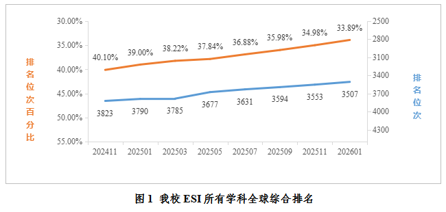2026年1月最新数据统计,在ESI所有学科综合排名中,全球共有10347家机构进入前1%,公司位列全球3507名,排名较去年同期(2025年1月)提升283名;位次百分比为33.89%,较去年同期提升5.11%。