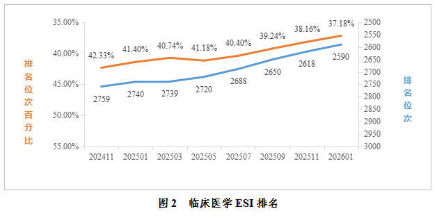 临床医学:据2026年1月数据统计,公司临床医学进入ESI前1%。全球共6966家进入全球前1%,公司位于全球第2590名,排名较去年同期提升150位;位次百分比为37.18%,较去年同期提升4.22%。